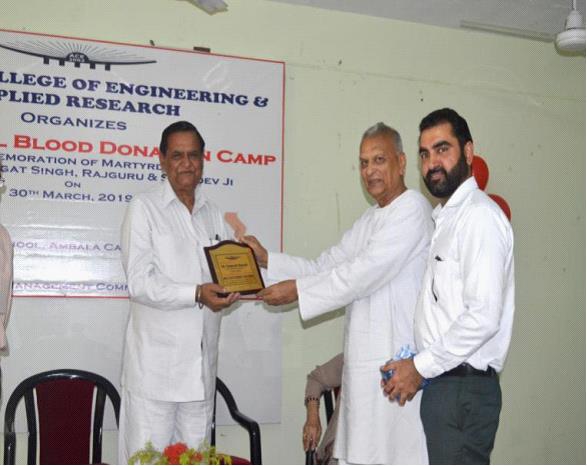 15th Annual Blood Donation Camp was organized on 30th March 2019. Blood Donation is ranked the best form of service to God. It is a regular feature of the college to commemorate the martyrdom of Shaheed Bhagat Singh Ji, Sukhdev Ji and Rajguru Ji. The Camp was organized with the help of Rotary and Blood Bank Society, Resource Centre, Sector-37, Chandigarh. The camp was inaugurated by Sh. Ramesh Bansal, Principal, DAV High School, Ambala Cantt, Chief Guest for the day and Mr. Anil Gupta, Member, Arya Pradeshik Pratinidhi Sabha, New Delhi, Guest of Honor for the event. Among the distinguished guests Sh. Ashwani Goel, BOG Member, Dr. Manish Rai, Director, Rotary and Blood Bank Society, Resource Centre, Sector-37, Chandigarh. and Mrs. Vinod Trehan, Social Worker were also present. Dr. Monica Khanna, HOD Applied Sciences & Humanities apprised the audience about the achievements of the guests which was followed by floral tribute to Martyrs by all dignitaries. In accordance with the event an informative speech on Blood Donation was delivered by Pushpinder Sharma, ME 2nd Year. audience with heartfelt memories of the struggle and sacrifice of our national heroes with her patriotic speech. The whole atmosphere was engulfed with the feelings of patriotism & love for our country by the patriotic song sung by the college choir. All and sundry who were present in the event observed one minute silence in the memory of our martyrs.